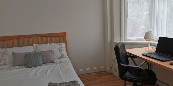 Downstairs, Large room, double bed, with desk, chair, wardrobe etc